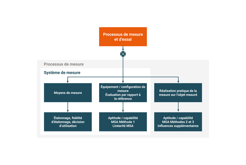La conception des processus de mesure décrite au chapitre 7.2 comprend l’identification des éléments de processus pertinents (opérateur, équipement, conditions environnementales, facteurs d’influence, procédures d’application) pour chaque processus de mesure.
