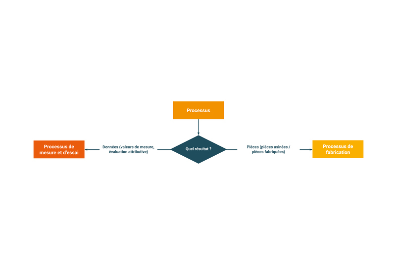 La sortie d’un processus détermine s’il s’agit d’un processus de mesure et d’essai ou d’un processus de fabrication. Lorsque la sortie est basée sur des données, telles que des valeurs de mesure ou des évaluations attributives, il s’agit de processus de mesure et d’essai. Lorsque la sortie est une pièce (pièce usinée, produit ou composant), on parle alors de processus de fabrication. Selon qu’il s’agisse d’un processus de mesure et d’essai ou d’un processus de fabrication, différentes méthodes d’assurance qualité sont appliquées.